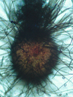 Spores (ascospores) of Chaetomium are produced within structures (asci) contained in a flask-shaped fruiting body known as perithecium. On spore maturity, the walls of the asci dissolve releasing mucilaginous spores within the perithecium. The spores ooze out of the perithecium (plural perithecia) and get trapped by coiled or dichotomously branched hairs that grow around the neck of the perithecium.